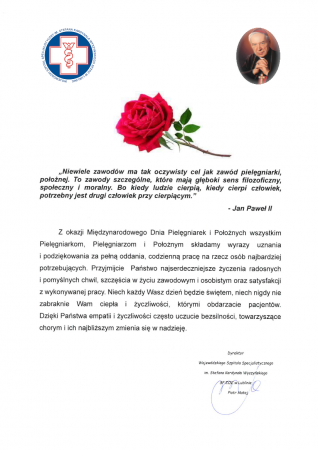 Z okazji Międzynarodowego Dnia Pielęgniarek i Położnych wszystkim Pielęgniarkom, Pielęgniarzom i Położnym składamy wyrazy uznania i podziękowania za pełną oddania, codzienną pracę na rzecz osób najbardziej potrzebujących. Przyjmijcie Państwo najserdeczniejsze życzenia radosnych i pomyślnych chwil, szczęścia w życiu zawodowym i osobistym oraz satysfakcji z wykonywanej pracy. Niech każdy Wasz dzień będzie świętem, niech nigdy nie zabraknie Wam ciepła i życzliwości, którymi obdarzacie pacjentów. Dzięki Państwa empatii i życzliwości często uczucie bezsilności, towarzyszące chorym i ich najbliższym zmienia się w nadzieję.